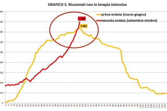I dati diffusi dalla Regione Lazio: tra marzo e giugno il picco di pazienti ricoverati aveva toccato quota 1.468, poi quel numero aveva cominciato a scendere rapidamente fino ai 100 ricoveri in media durante i mesi estivi. Oggi sono 1.599, già oltre 100 in più rispetto alla quota massima raggiunta durante la prima ondata.
