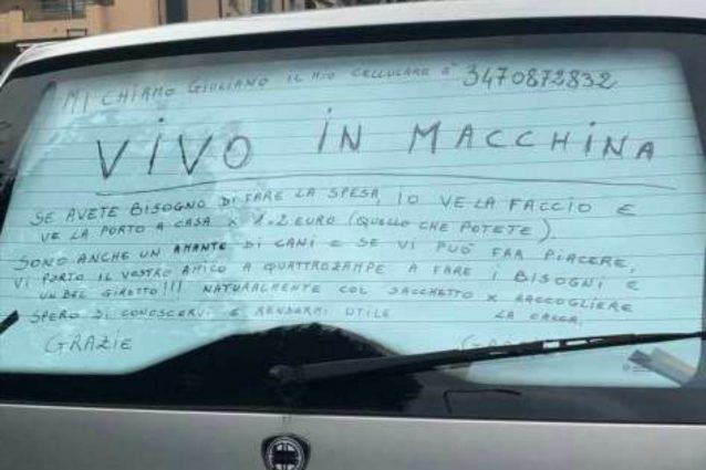 Giuliano ha 66 anni e da otto anni è costretto a vivere in macchina a Milano. Una vita che inizia nel 2012 quando si separa dalla moglie. Negli anni ha ricevuto tanta solidarietà e dimostrazioni di affetto e in questo momento così terribile ha deciso di ricambiare l'aiuto ricevuto, portando la spesa agli anziani o portando a spasso i cani che gli vengono affidati: "Soffro di depressione, ho trovato aiutando gli altri la forza per andare avanti".